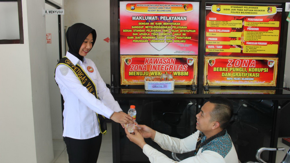 Deni Apriyanto, warga Kota Bojonegoro yang sedang mengurus SKCK mengungkapkan bahwa dirinya merasa senang dengan adanya pelayanan dari petugs yang ramah, cepat juga diberi makanan ringan serta air mineral.
