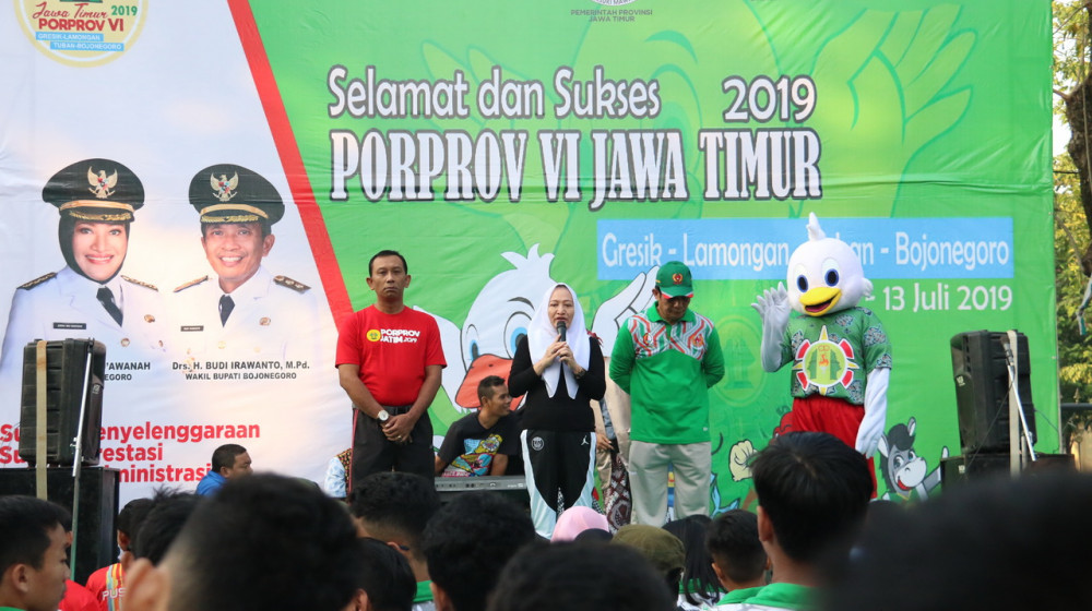 Bupati Bojonegoro, Dr Hj Anna Muawanah; dalam sambutannya berharap kepada masyarakat Bojonegoro untuk mendukung para atlet Kabupaen Bojonegoro dalam gelaran Porprov Jatim 2019.