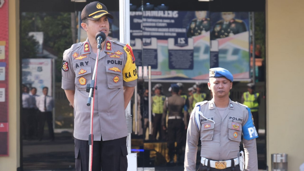 Kapolres Bojonegoro AKBP Ary Fadli SIK MH MSi saat memimpin apel pemberian reward kepada delapan pelajar berprestasi, pemenang lomba Gebyar Santri Angling Dharma. Senin (15/07/2019)