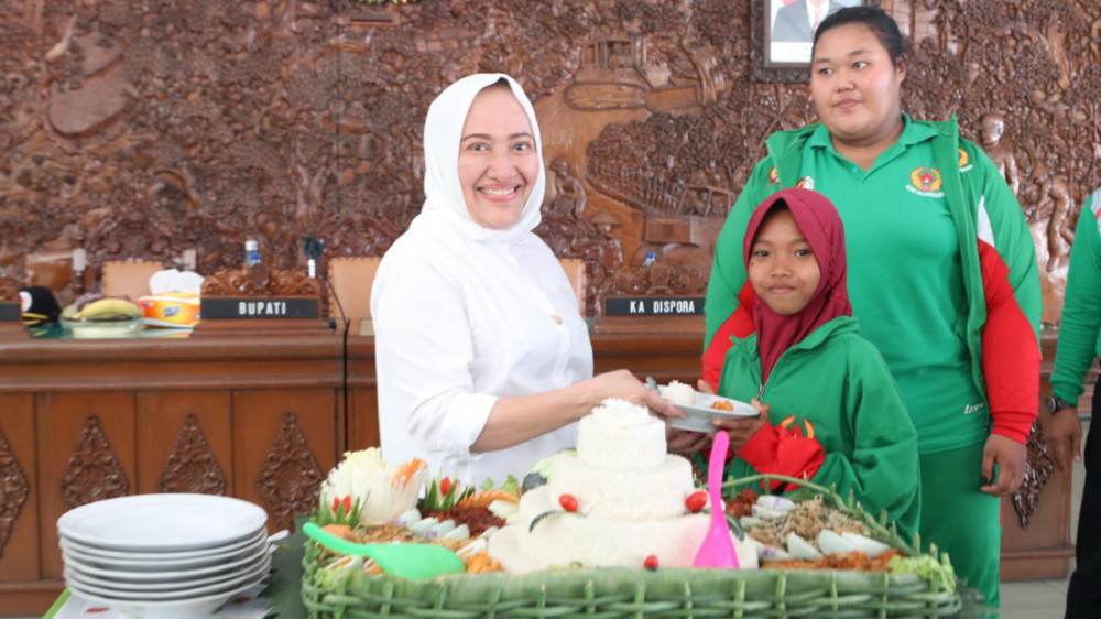 Bupati Bojonegoro, Dr Hj Anna Muawanah saat serahkan potongan tumpeng pada perwakilan atlet, sebagi tanda Pembubaran Panita Porprov tingkat Kabupaten Bojonegoro.