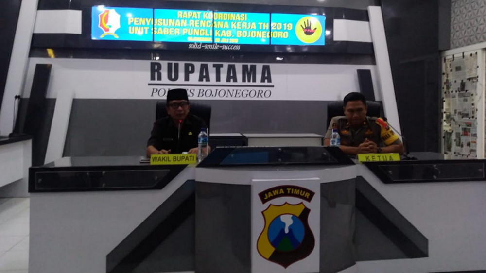 Bojonegoro - Wakil Bupati Bojonegoro, Drs Budi Irawanto MPd, memberikan sambutan sekaligus membuka acara Rapat Koordinasi Penyusunan Kerja Tahun 2019, Unit Satuan Tugas Sapu Bersih Pungutan Liar (Saber Pungli) Kabupaten Bojonegoro.