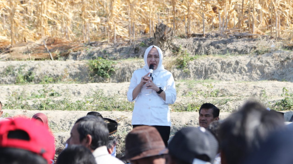 Bupati Bojonegoro, Dr Hj Anna Muawanah, saat beri sambutan dalam acara tasyakuran pembangunan sudetan Kali Gandong, di Dukuh Sugihan Desa Kedungsumber Kecamatan Temayang Kabupatten Bojonegoro. Rabu (31/07/2019)