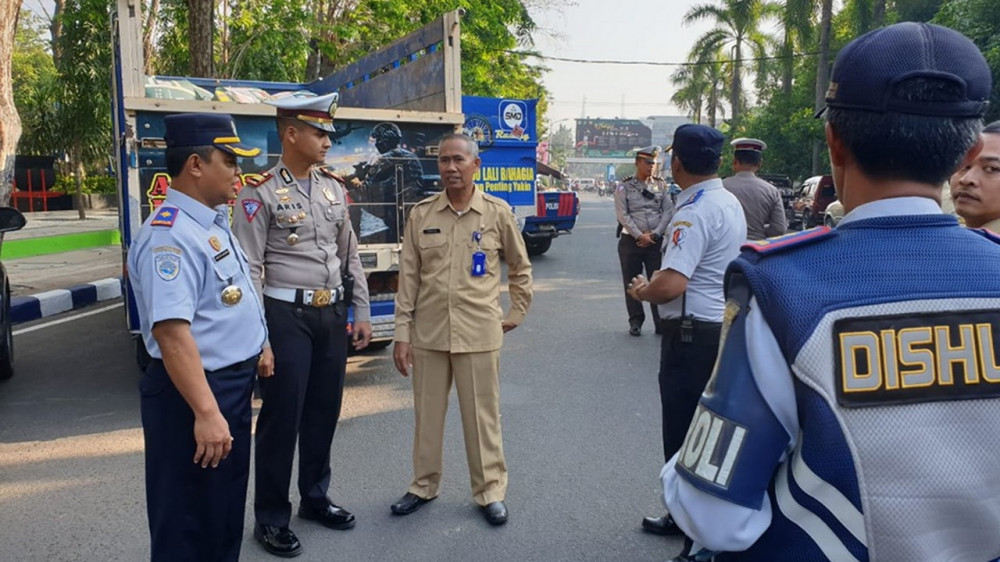 Kepala Dishub Bojonegoro, Adie Wijaksono SSos MSi, (paling kiri) bersama Kasat Lantas Polres Bojonegoro, Aristianto BS SH SIK MH, (nomor dua dari kiri) dan Kabag Kesra Setda Pemkab Bojonegoro, Drs Sahari MM (nomor tiga dari kiri), di sela-sela kegiatan cek fisik terhadap kelaikan bus dan truk untuk keberangkatan para jamaah calon haji. Selasa (30/07/2019)