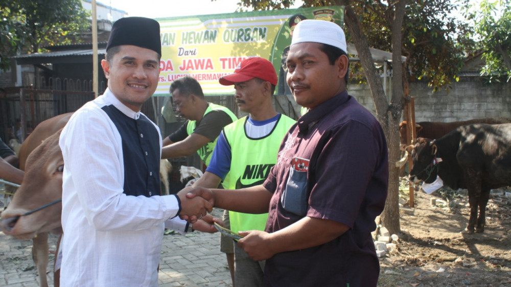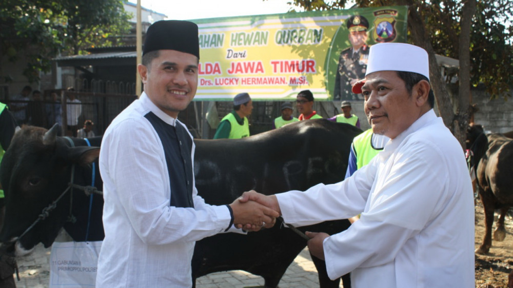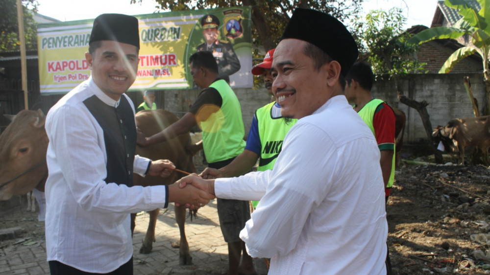 Bojonegoro - Di Hari Raya Iduladha 1440 H tahun 2019 ini, Kapolres Bojonegoro AKBP Ary Fadli SIK MH MSi, pada Minggu (11/08/2019) pagi, salurkan hewan kurban berupa empat ekor sapi dari Kapolda Jawa Timur, Irjen Pol Drs Luki Hermawan MSi, kepada empat pondok pesantren yang ada di Bojonegoro.