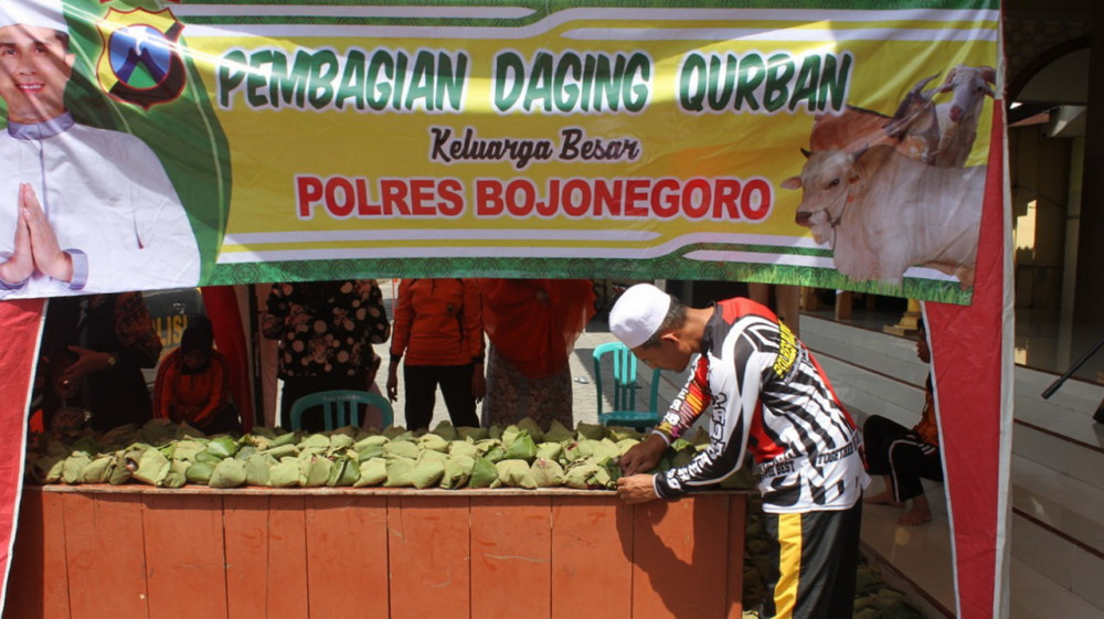 Bojonegoro - Pada perayaan Iduladha 1440 H kali ini, Polres Bojonegoro menyembelih 8 ekor sapi dan 27 ekor kambing. Menariknya, daging sapi dan kambing yang telah dipotong tersbut selanjutnya dibungkus menggunakan daun jati, menjadi 1.500 paket daging untuk selanjutnya dibagikan kepada masyarakat yang berhak.