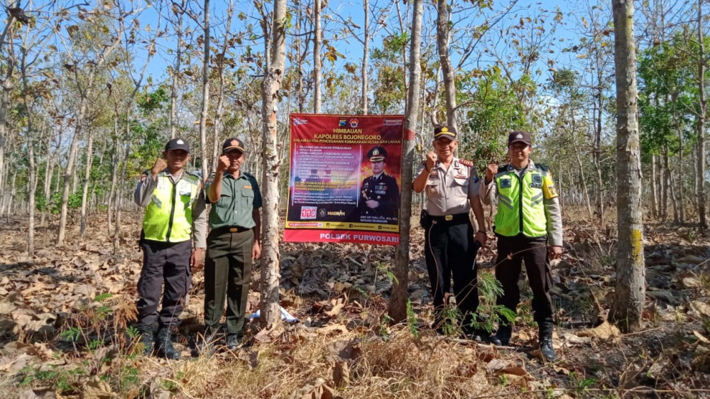 Untuk mengantisipasi terjadinya kebakaran hutan dan lahan (karhutla), Kapolsek Purwosari AKP Yaban SE, bersama anggotanya dan pihak Perhutani pada Rabu (14/08/2019) sore, melaksanakan pemasangan banner atau spanduk imbauan terkait potensi kebakaran hutan dan lahan (karhutla), di petak 29E dan petak 29D RPH Kuniran BKPH Tobo KPH Padangan, tepatnya di Desa Kuniran Kecamatan Purwosari Kabupaten Bojonegoro.