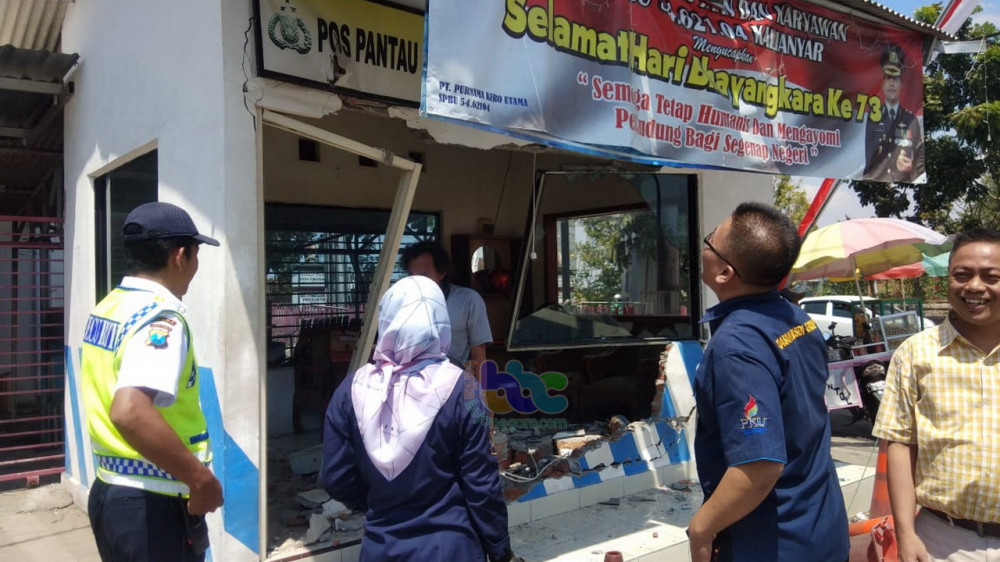Diduga Rem Blong, Bus Dali Jaya Tabrak Pos Polisi di Area SPBU Kalianyar Bojonegoro