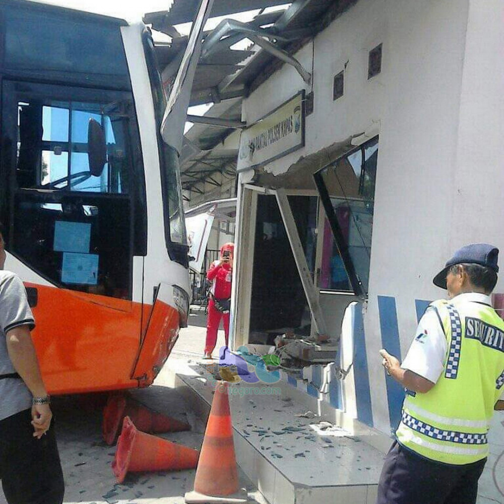 "Diduga rem bus dalam keadaan blong, sehingga bus tersebut kemudian menabrak pos pantau yang ada di SPBU tersebut dan kemudian bus baru berhenti," kata Kapolsek.