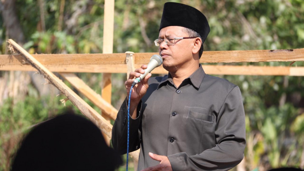 Perwakilan panitia pembangunan masjid Al Muttaqin, KH Muhaimin saat beri sambutan dalam acara peletakan batu pertama pembangunan Masjid Al Muttaqin di Dusun Klumpang Desa Sendangharjo Kecamatan Ngasem Bojonegoro. Kamis (15/08/2019)
