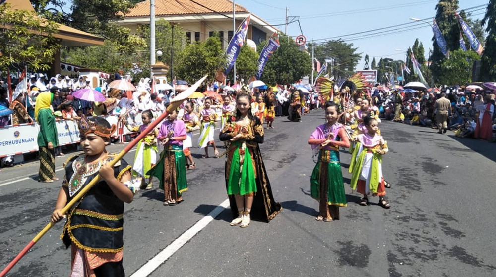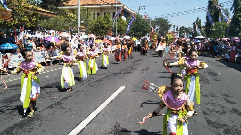 Blora - Karnaval atau Pawai Budaya pelajar tingkat PAUD/TK, SD dan SMP, dalam rangka peringatan Hari Ulang Tahun (HUT) ke 74 Kemerdekaan RI dengan tema Generasi Muda Blora Yang Kreatif dan Berbudaya Dalam Harmoni Nusantara, tingkat Kabupaten Blora yang digelar Senin (19/08/2019), berlangsung meriah.