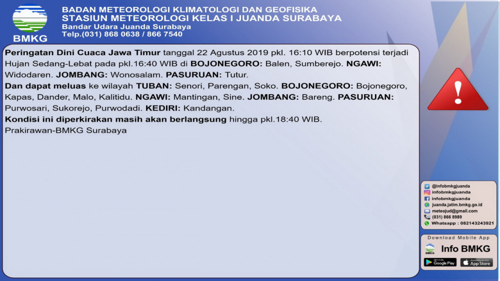 Terpisah, Sekretaris Badan Penanggulangan Bencana Daerah (BPBD) Kabupaten Bojonegoro, Nadif Ulfia SSos, kepada awak media ini menuturkan bahwa berdasarkan prakiraan cuaca yang ia terima dari Badan Meteorologi, Klimatologi dan Geofisika Stasiun Meteorologi Kelas 1 Juanda Surabaya disebutkan bahwa pada Kamis (22/08/2019) pukul 16.10 WIB, di wilayah Kabupaten Bojonegoro, khususnya di Kecamatan Balen dan Sumberrejo, berpotensi terjadi hujan degan intensitas sedang hingga lebat.