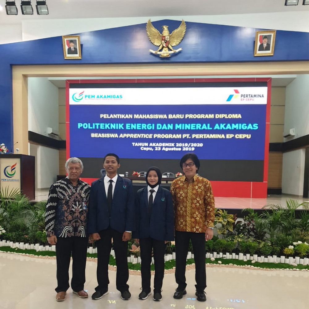 Dua orang perwakilan peserta, Ryanto Prawiro Negoro dan Reni Udiyanti, saat foto bersama Direktur PEM Akamigas, Prof Dr Perry Burhan dan Direktur Operasi PEPC, Achmad Zaidy. Di ela-sela upacara pelantikan 108 mahasiswa baru PEM Akamigas, Program Diploma Apprentice Program PEPC. Jumat (23/08/2019)