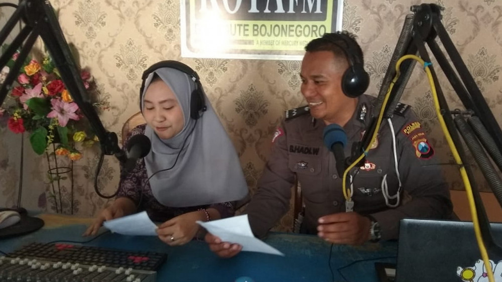 Anggota Unit Dikyasa Sat Lantas Polres Bojonegoro, saat laksanakan sosialisasi melalui salah satu radio di Bojonegoro. Rabu (28/08/2019)