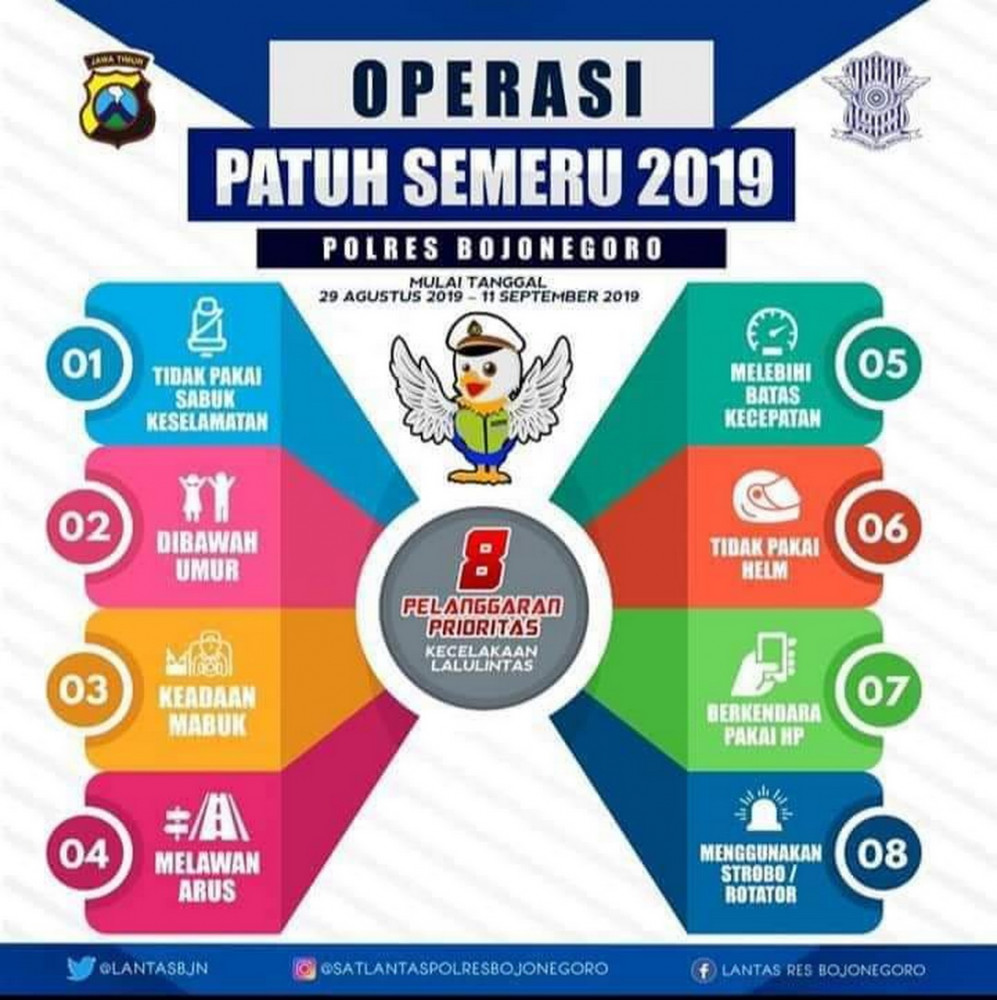 Operassi Patuh 2019, akan digelar secara serentak di seluruh Indonesia selama 14 hari, mulai Kamis (29/08/2019) hingga Rabu (11/09/2019) mendatang, dalam upaya mengurangi angka kecelakaan di jalan raya dan menekan angka pelanggaran lalu lintas. Dalam operasi tersebut, petugas akan memprioritaskan penindakan pelanggaran potensi kecelakaan dengan fatalitas korban yang tinggi.
