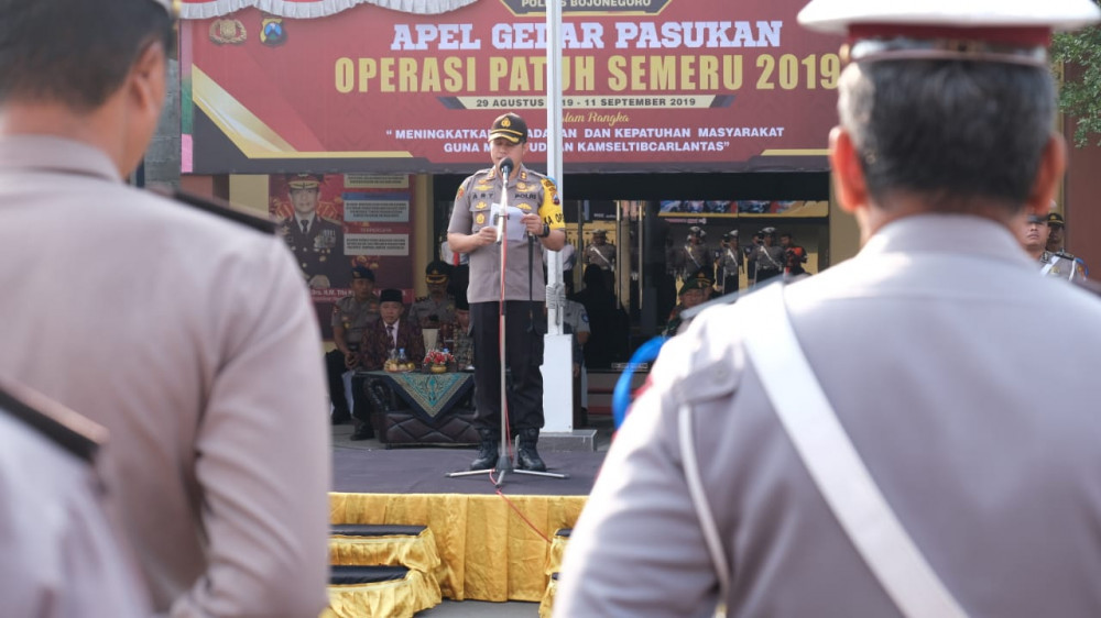Bojonegoro - Polres Bojonegoro, pada Kamis (29/08/2019), bertempat di Halaman Mapolres Bojonegoro, laksanakan Apel Gelar Pasukan, Operasi Patuh Semeru 2019, yang dipimpin langsung oleh Kapolres Bojonegoro, AKBP Ary Fadli SIK MH MSi.