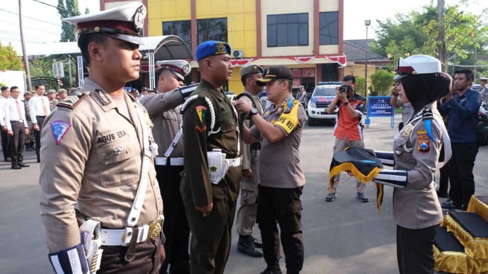 Kapolres Bojonegoro, AKBP Ary Fadli SIK MH MSi saat menyematkan pita kepada perwakilan dari Anggota Polri, TNI, Satpol PP dan Dinas perhubungan, sebagai tanda dimulainya Operasi Patuh Semeru 2019 di Kabupaten Bojonegoro.