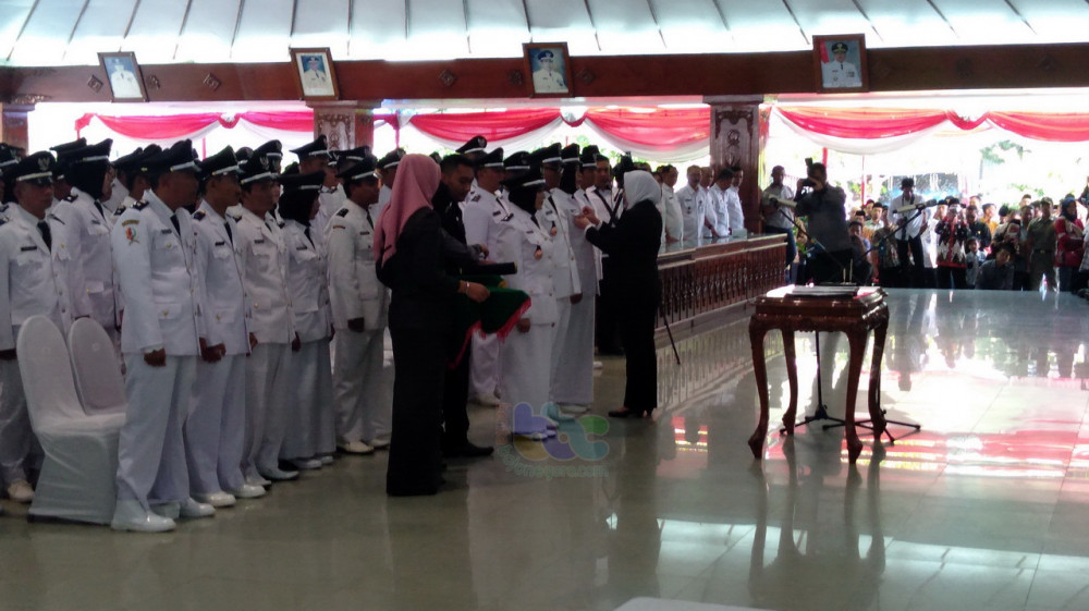 Bojonegoro –Bupati Bojonegoro, Dr Hj Anna Muawanah, pada Rabu (04/09/2019) pagi, bertempat di Pendapa Malowopati, Pemkab Bojonegoro, lantik 154 kepala desa (kades) yang terpilih dalam Pemilihan Kepala Desa (Pilkades) Serentak Tahun 2019, yang digelar Rabu (26/06/2019) lalu.