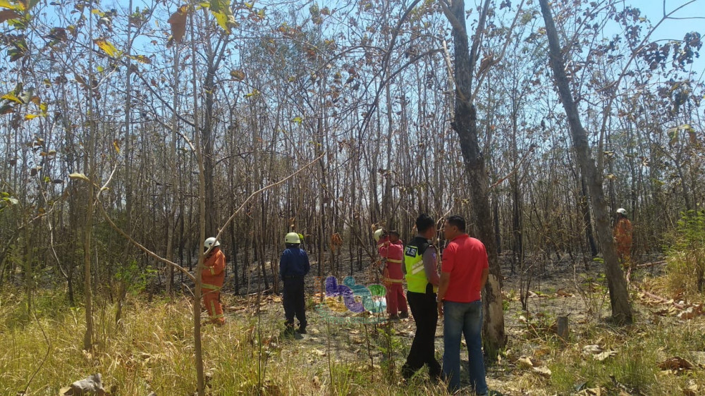 Bojonegoro (Baureno) - Semak belukar dan rontokan daun jati yang sudah mengering, yang berada di lahan kebun jati milik warga di Dusun Kedungrejo Desa Gunungsari Kecamatan Baureno Kabupaten Bojonegoro, seluas kurang lebih 3,5 hektare, pada Selasa (10/09/2019) sekira pukul 09.45 WIB pagi, terbakar.