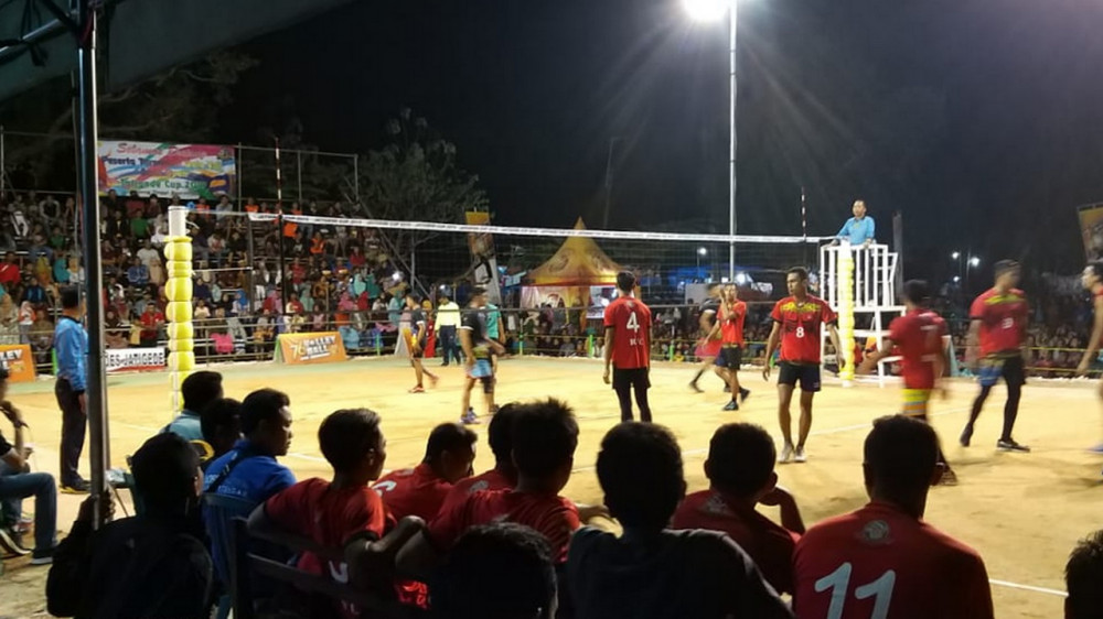 Salah satu pertandingan dalam Turnamen Bola Voli Semi Open Jatigede Cup 2019, di Lapangan Bola Voli Dusun Mlangi Desa Jatigede Kecamatan Sumberrejo Bojonegoro. Selasa (10/09/2019)
