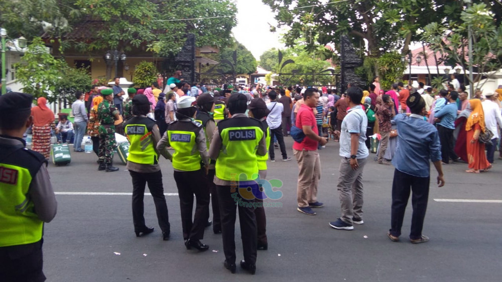 Anggota Polres Bojonegoro, saat laksanakan pengamanan kepulangan jemaah haji Kabupaten Bojonegoro di sekitar Pendapa Pemkab Bojonegoro. Kamis (12/09/2019)