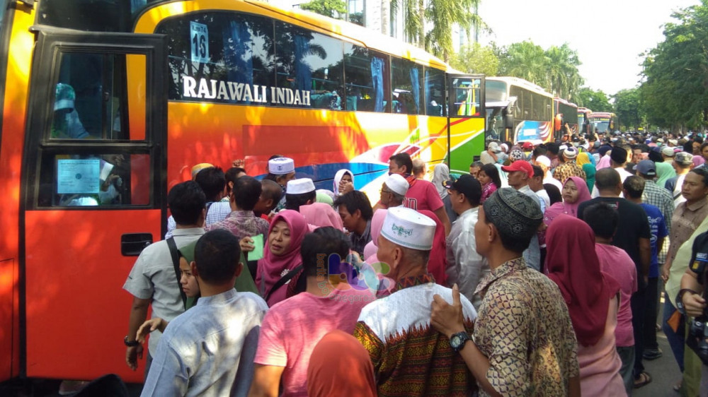 Keluarga para jemaah haji saat menemui jemaah yang baru tiba, di Jalan Mas Tumapel, depan Pendapa Pemkab Bojonegoro. Kamis (12/09/2019)