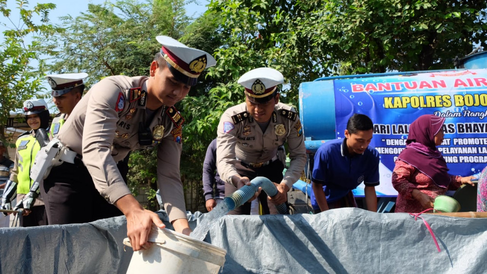 Sebanyak 6 unit mobil tangki air bersih, bantuan dari Kapolres Bojonegoro disalurkan langsung kepada masyarakat oleh Kasat Lantas AKP Aristianto BS SH SIK MH, bersama  para sejumlah perwira dan anggota Sat Lantas Polres Bojonegoro.