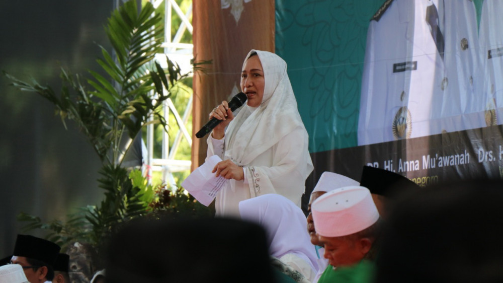Bupati Bojonegoro, Dr Hj Anna Muawanah saat hadiri acara Gema Salawat Yatama Millenial, di Alun-alun Bojonegoro. Minggu (06/10/2019)