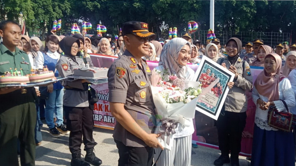 Kapolres Bojonegoro, AKBP Ary Fadli SIK MH MSi, saat terima ucapan selamat ulang tahun karangan bunga, yang dilanjutkan dengan peniupan lilin ulang tahun dan pemotongan kue. Selasa (08/10/2019)
