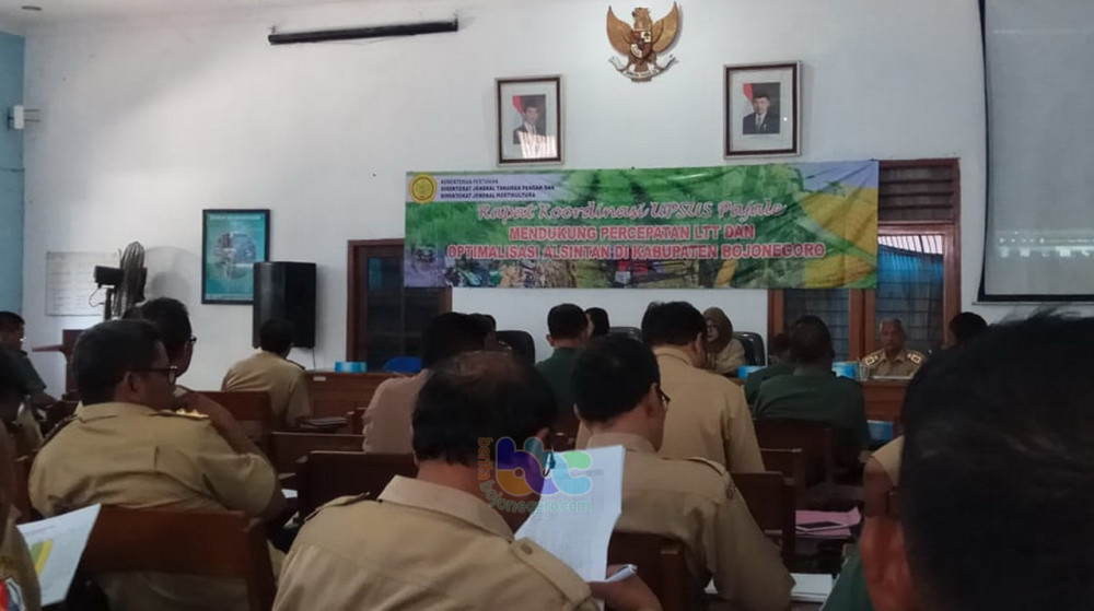 Bojonegoro - Pemerintah Kabupaten (Pemkab) Bojonegoro, melalui Dinas Pertanian Kabupaten Bojonegoro pada Senin (14/10/2019), gelar Rapat Kordinasi (Rakor) Upaya Khusus (Upsus) percepatan swasembada padi, jagung, dan kedelai (Pajale), guna mendukung Percepatan luas tambah tanam (LTT) dan optimalisasi atau pemanfaatan alat mesin pertanian (alsintan) tingkat Kabupaten Bojonegoro.