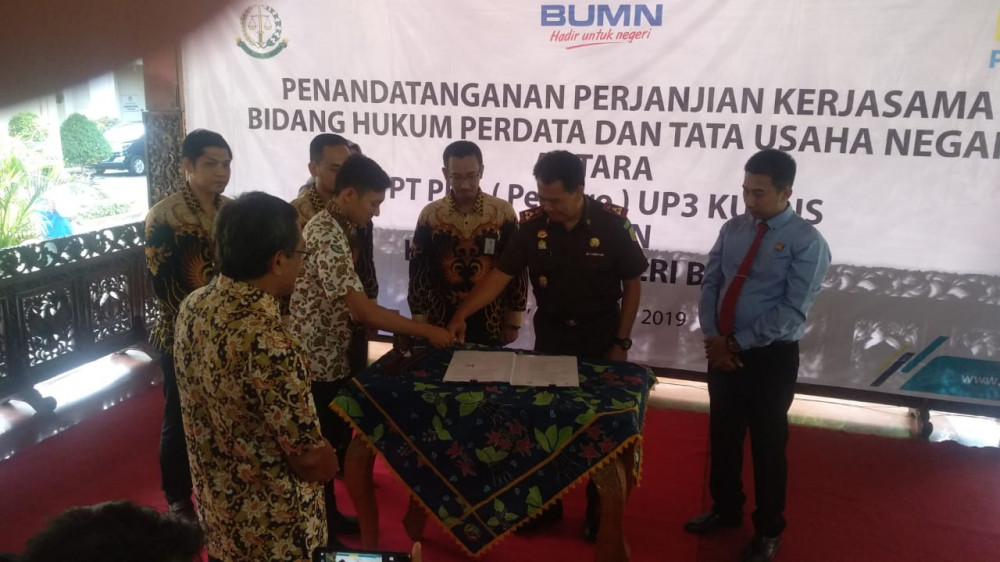 Penanda-tanganan saling pengertian (MoU) bidang hukum ketatausahaan negara antara PLN UP3 Kudus dengan Kejaksaan Negeri Blora, di sela acara Multi Stakeholder Gathering, yang digelar PLN UP3 Kudus, di Pendopo Rumah dinas Bupati. Rabu (16/10/2019)