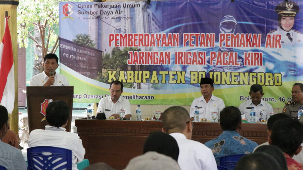 Bojonegoro - Pemerintah Kabupaten (Pemkab) Bojonegoro melalui Dinas Pekerjaan Umum Sumber Daya Air (PU SDA) Kabupaten Bojonegoro, pada Rabu (16/10/2019), bertempat di Balai Desa Kedaton Kecamatan Kapas Bojonegoro, gelar acara pembinaan kepada Himpunan Petani Pemakai Air (HIPPA) dan Gabungan Himpunan Petani Pemakai Air (GHIPPA) jaringan irigasi Pacal kiri.