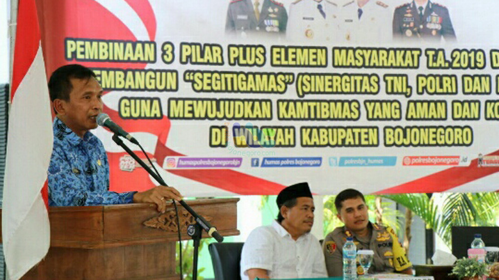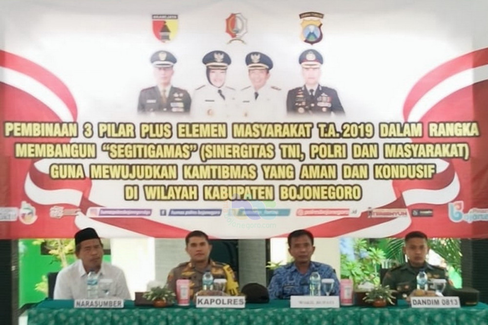 Bojonegoro - Polres Bojonegoro, bersama tiga pilar plus, pada Kamis (17/10/2019), menggelar pembinaan tiga pilar plus dan elemen masayarakat dalam rangka membangun sinergitas TNI, Polri dan Masyarakat (Segitigamas) guna mewujudkan Kamtibmas yang aman dan Kondusif di wilayah Kabupaten Bojonegoro.