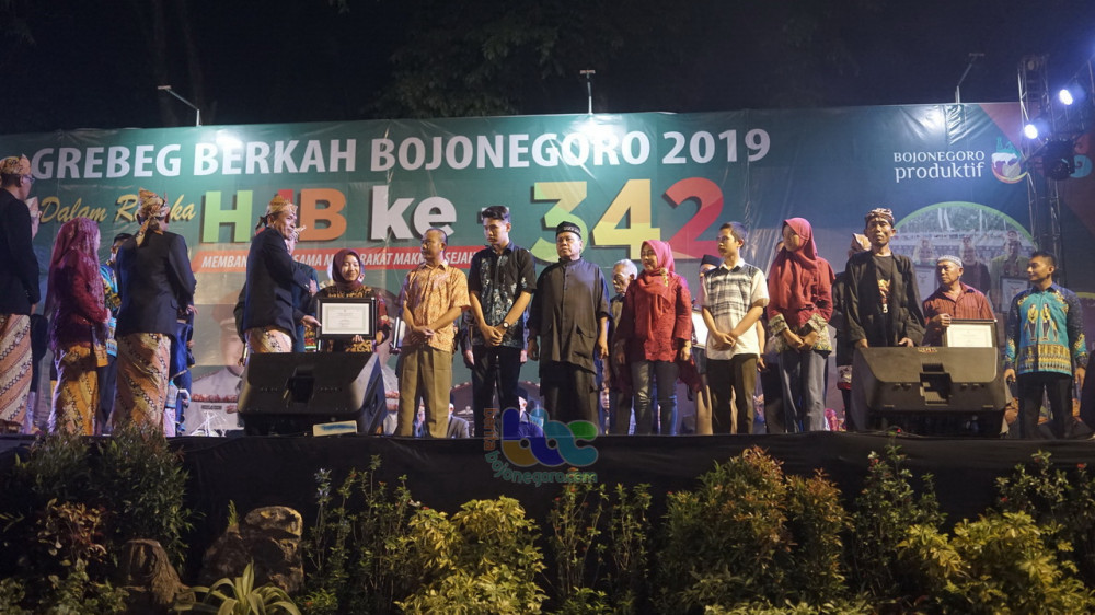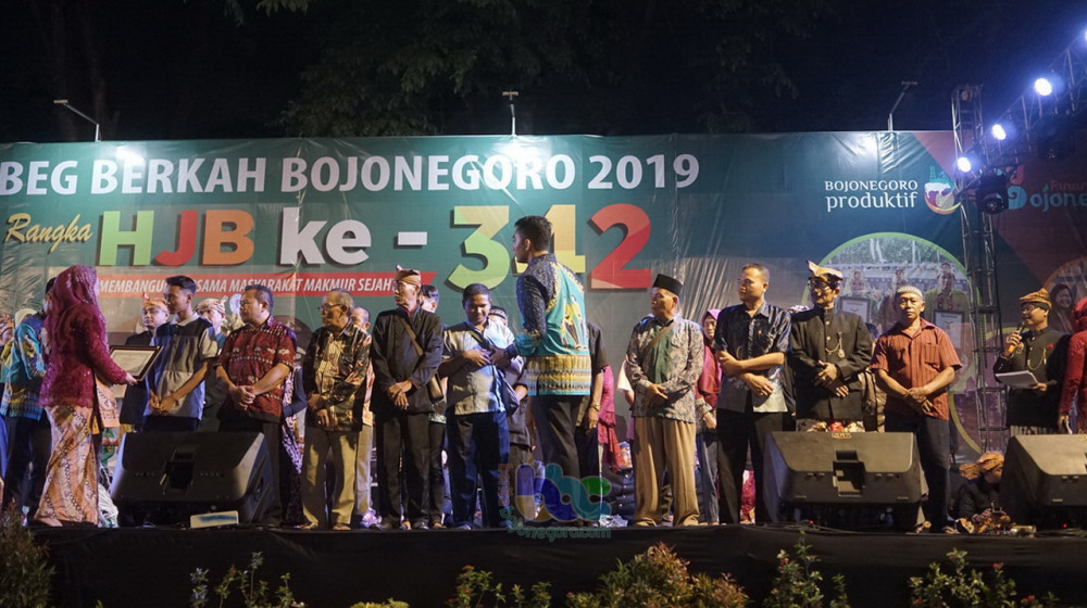 Bojonegoro - Dalam Grebeg Berkah Bojonegoro, sebagai puncak peringatan Hari Jadi Kabupaten Bojonegoro (HJB) ke-342 tahun 2019, Sabtu (19/10/2019) malam, perwakilan seniman dari 28 kecamatan di Kabupaten Bojonegoro, terima penghargaan dari Pemerintah Kabupaten (Pemkab) Bojonegoro.