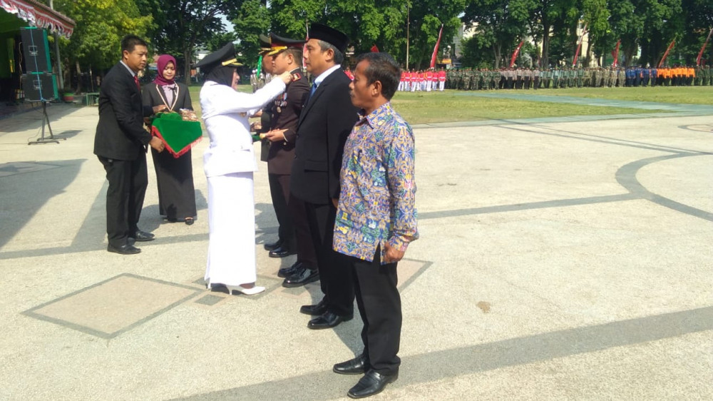 Bupati Bojonegoro, Dr Hj Anna Muawanah, saat berikan pengharggan dalam upacara Peringatan Hari Jadi Kabupaten Bojonegoro ke-342 dan Peringatan Hari Jadi Provinsi Jawa Timur ke 74, di Alun-alun Bojonegoro, Minggu (20/10/2019).