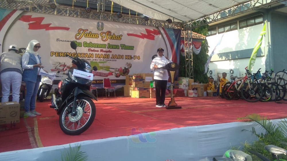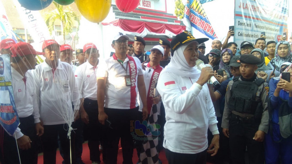 Bojonegoro - Gubernur Jawa Timur, Dra Hj Khofifah Indar Parawansa MSi, pada Sabtu (26/10/2019), berangkatkan peserta jalan sehat dalam rangka memperingati Hari Jadi Pemerintah Propinsi Jawa Timur ke-74, di depan Kantor Badan Kordinasi Wilayah (Bakorwil) Bojonegoro.