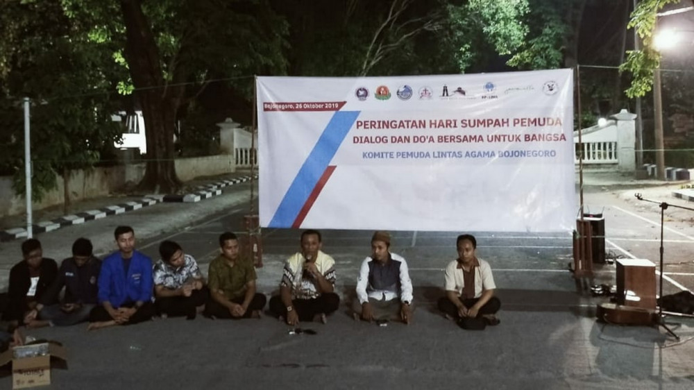 Diskusi dan doa bersama, yang digelar Komite Pemuda Lintas Agama (KP Lima) Bojonegoro, dalam rangka menyambut Hari Pemuda atau Sumpah Pemuda. Sabtu (26/10/2019) di halaman Gedung DPRD Kabupaten Bojonegoro