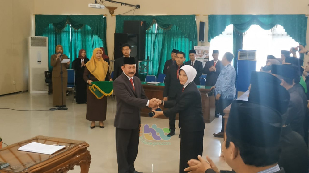 Serah terima jabatan dari Pj Sekda Kabupaten Bojonegoro, Drs Abimanyu Ponco Atmojo Iswinarno MM, kepada Dra Nurul Azizah MM, selaku Sekda Kabupaten Bojonegoro definitif. Senin (28/10/2019) siang.