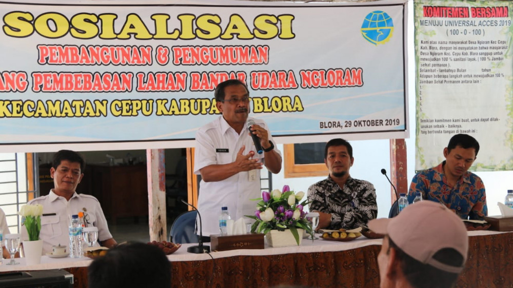 Blora - Pemerintah Kabupaten (Pemkab) Blora melalui Dinas Perumahan, Permukiman dan Perhubungan (Dinrumkimhub), pada Selasa (29/10/2019) melaksanakan Sosialisasi Pembangunan dan Pengumuman Peta Bidang Pembebasan Lahan untuk pengembangan fasilitas Bandara Ngloram.