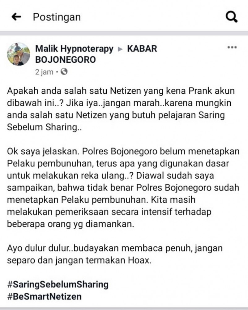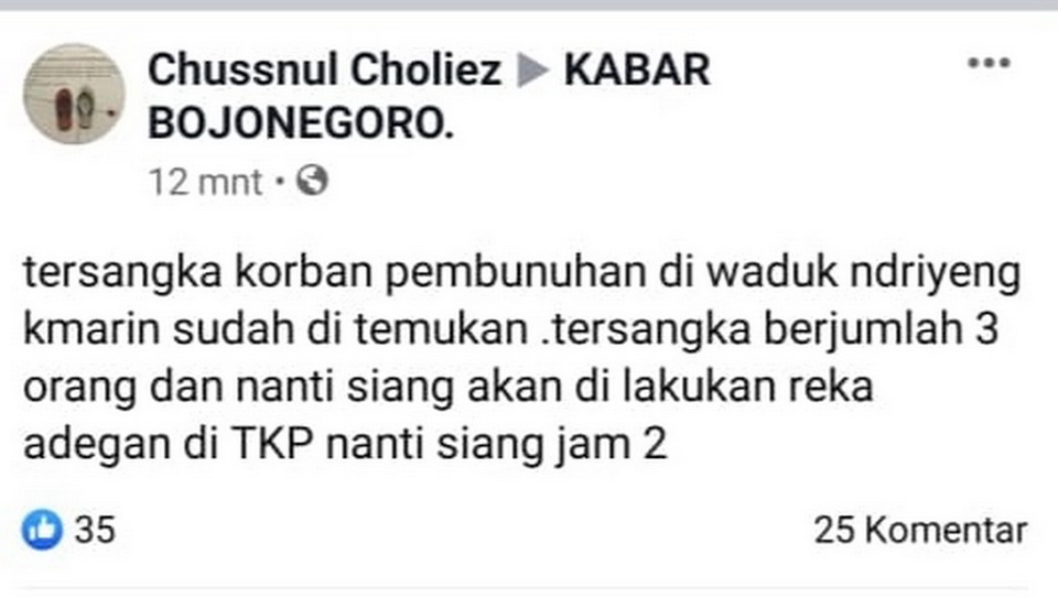 Sementara itu, dari penelusuran awak media ini diduga warga mendapatkan informasi dari postingan salah satu member grup facebook KABAR BOJONEGORO, dengan akun Chussnul Choliez, yang memposting: