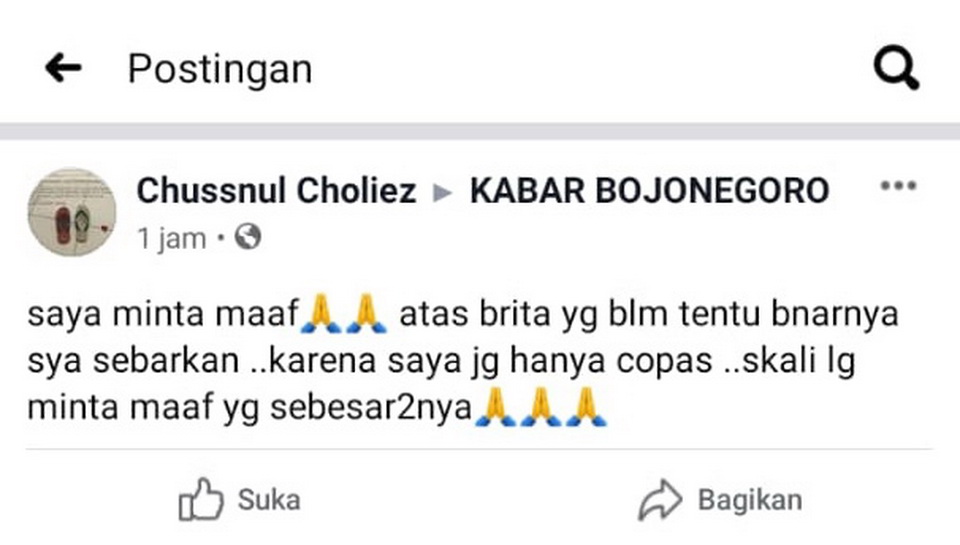 "saya minta maaf atas brita yg blm tentu bnarnya sya sebarkan .. karena saya jg hanya copas ..skali lg minta maaf yg sebesar2nya" (dan/imm)