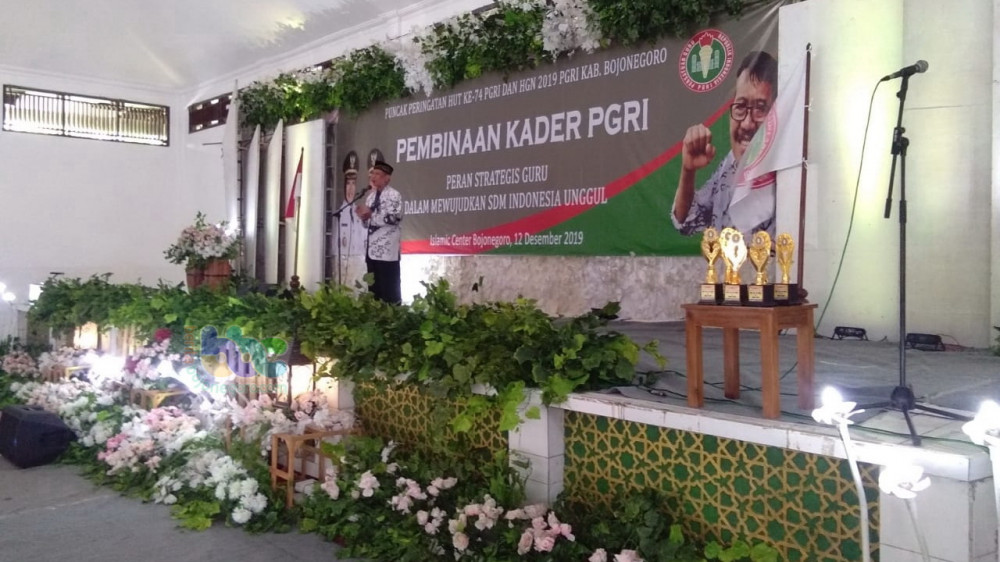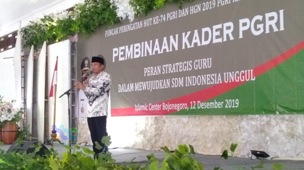 Bojonegoro - Puncak peringatan Hari Ulang Tahun (HUT) ke-74 Persatuan Guru Republik Indonesia (PGRI) dan Hari Huru Nasional (HGN) 2019, PGRI Kabupaten Bojonegoro pada Kamis (12/12/2019) gelar acara Pembinaan Kader PGRI, yang mengambil tema 'Peran Strategis Guru dalam Memwujudkan SDM Indonesia Unggul"