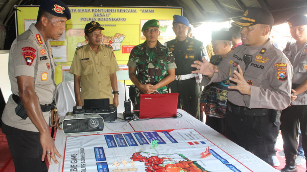 Bojonegoro - Dalam rangka persiapan menghadapi bencana alam tahun 2019-2020, di wilayah Jawa Timur, pada Senin (16/12/2019) bertempat di lapangan Jembatan Sosrodilogo Kecamatan Trucuk Kabupaten Bojonegoro, digelar Apel Gelar Pasukan, Satuan Tugas (Satgas) Operasi Kontijensi dengan sandi Aman Nusa II.