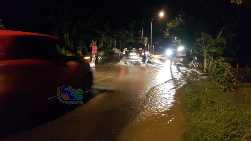 Kondisi banjir yang menggenangi jalan raya di Kecamatan Dander Bojonegoro, Senin (30/12/2019) malam.