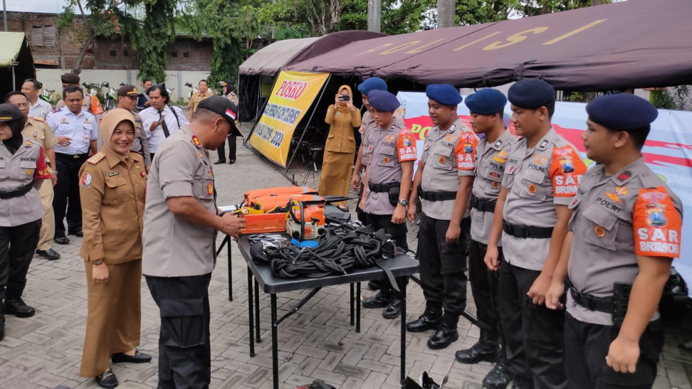 Kapolres Bojonegoro bersama Sekda Bojonegoro saat mengecek kesiapan personel serta alat kelengkapan peralatan tanggap bencana. Senin (06/01/2020)