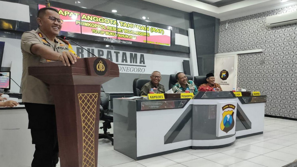 "Saya berterima kasih sekali atas kegiatan dan tahapan-tahapan yang sudah dipenuhi oleh Primkoppol Polres Bojonegoro ini, selamat menjalakan RAT. Saya minta tolong bapak ibu yang punya suara, untuk perfikir bagaimana perkembangan Primkoppolres Bojonegoro selanjutnya," kata Drs Setyo Yuliono