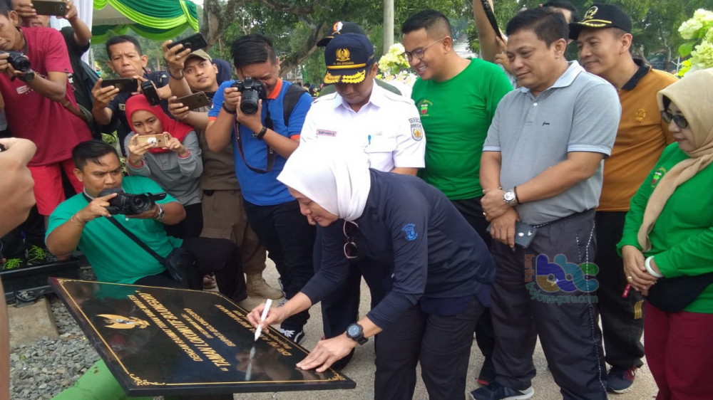 Bupati Bojonegoro, Dr Hj Anna Muawanah, saat tandatangi prasasti peresmian pembukaan Taman Lokomotif di Jalan Teuku Umar Bojonegoro. Jumat (24/01/2020)