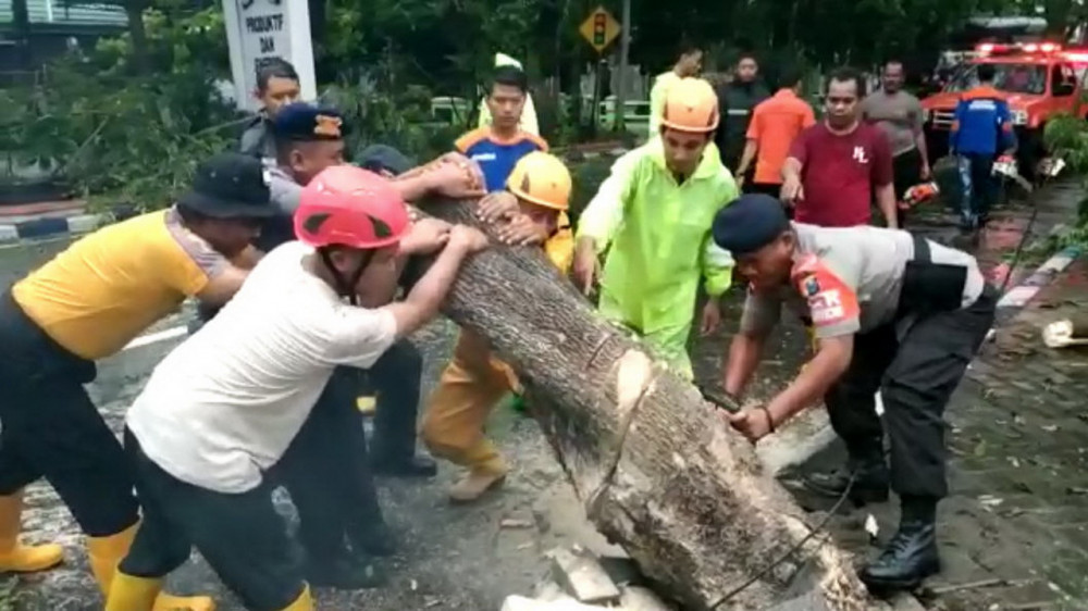 Petugas BPBD Bojonegoro bersama aparat kepolisian saat mengevakuasi pohon tumbang di Jalan Basuki rahmad Bojonegoro. Kamis (30/01/2020)