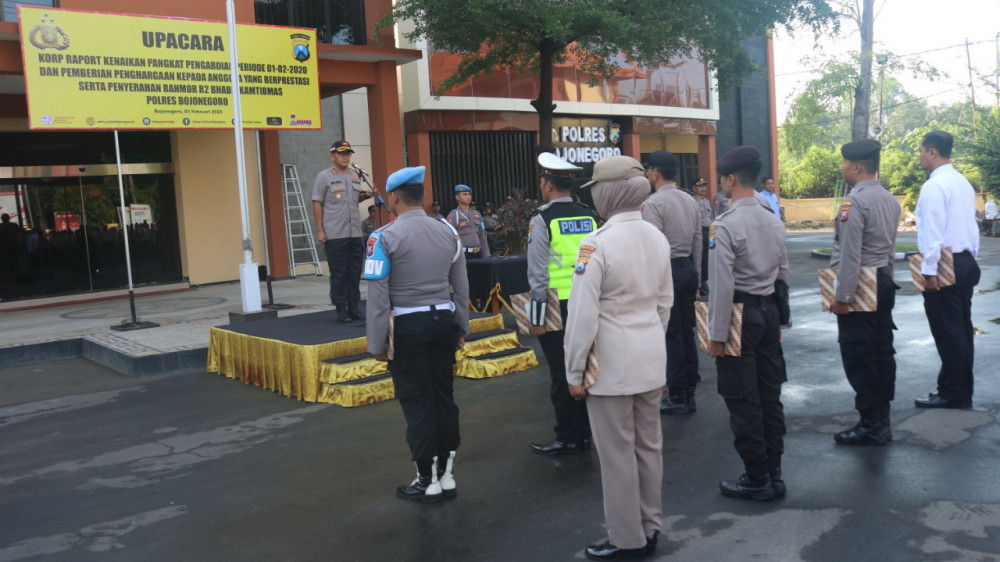 Upacara Korp Raport Kenaikan Pangkat Pengabdian, di halaman Polres Bojonegoro. Senin (03/02/2020).