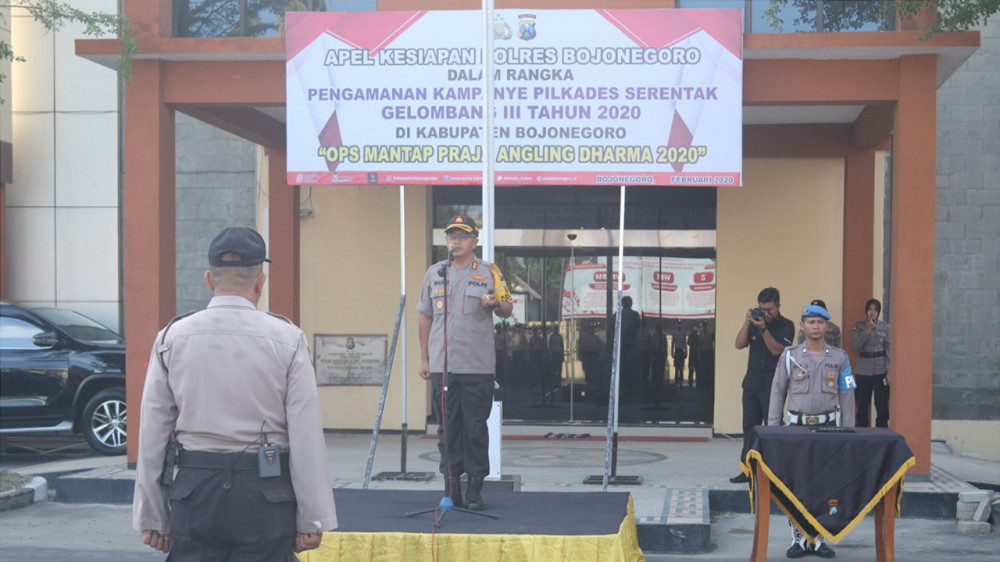 Kapolres Bojonegoro, AKBP M Budi Hendrawan SIK MH, Apel Kesiapan pengamanan Pilkades Serentak 2020 Kabupaten Bojonegoro. Senin (10/02/2020)