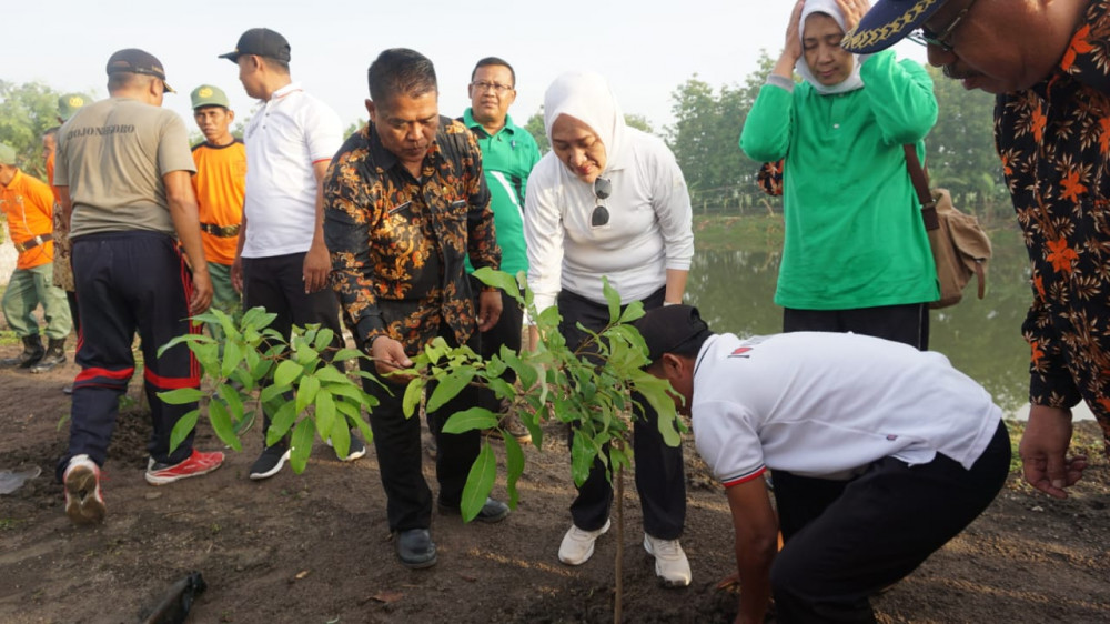 Bupati Bojonnegoro Dr Hj Anna Muawanah, saat menanam pohon kelengkeng secara simbolis di taman wisata baru "Sidomukti Park di Kecamatan Kepohbaru. Kamis (13/02/2020) pagi.